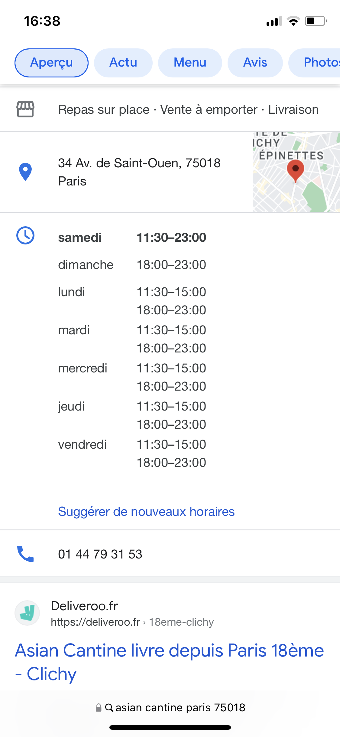 Voici toutes les informations sur le Restaurant cambodgien Asian cantine qui ce trouve au 34 Av. de Saint-Ouen, 75018 Paris (75). Sur cette fiche vous trouverez les photos, l'adresse, les horaires d'ouverture, le numero de téléphone et les avis clients.Vous pouvez églement rédiger un avis si vous le souhaitez en bas de page.