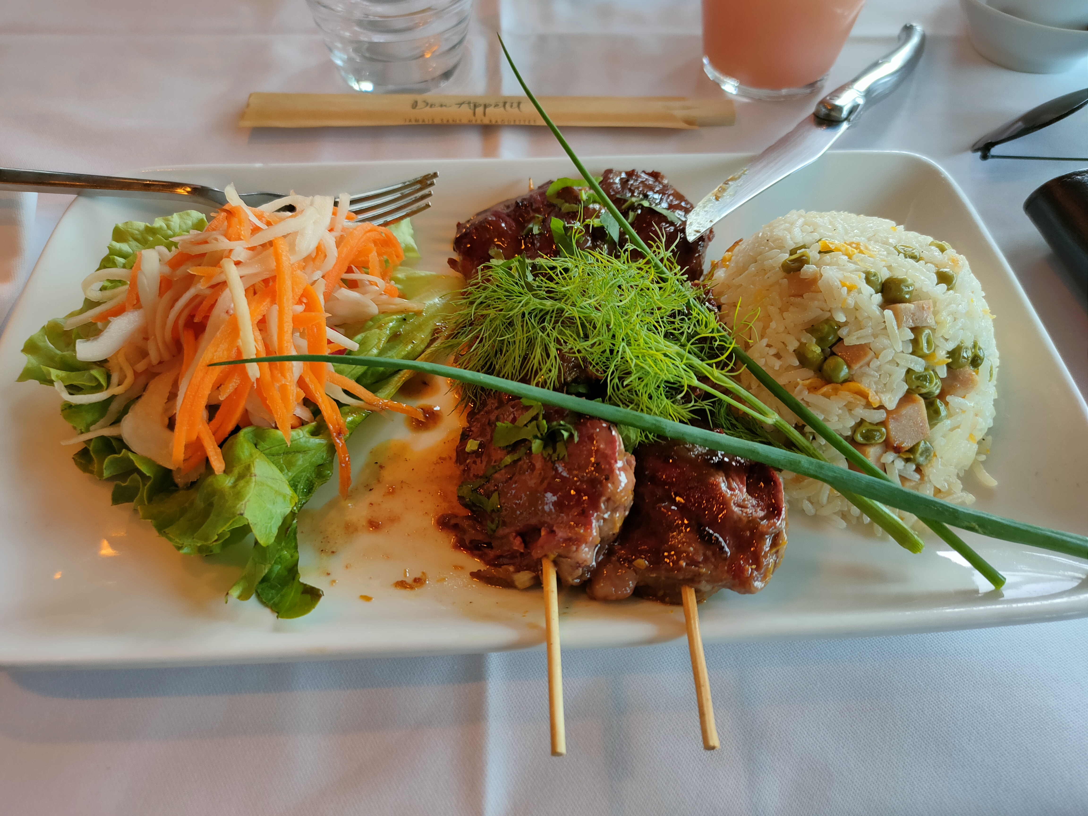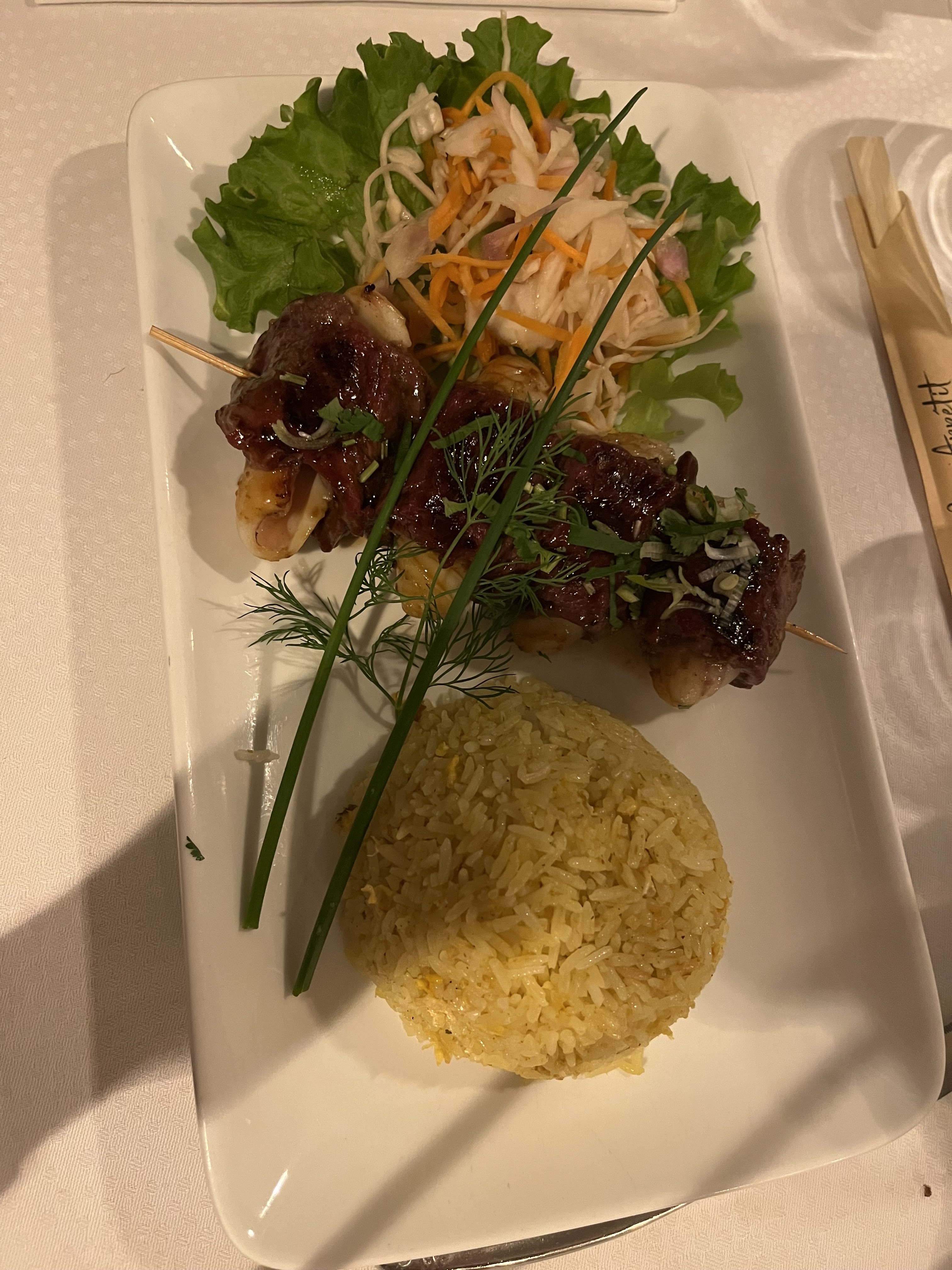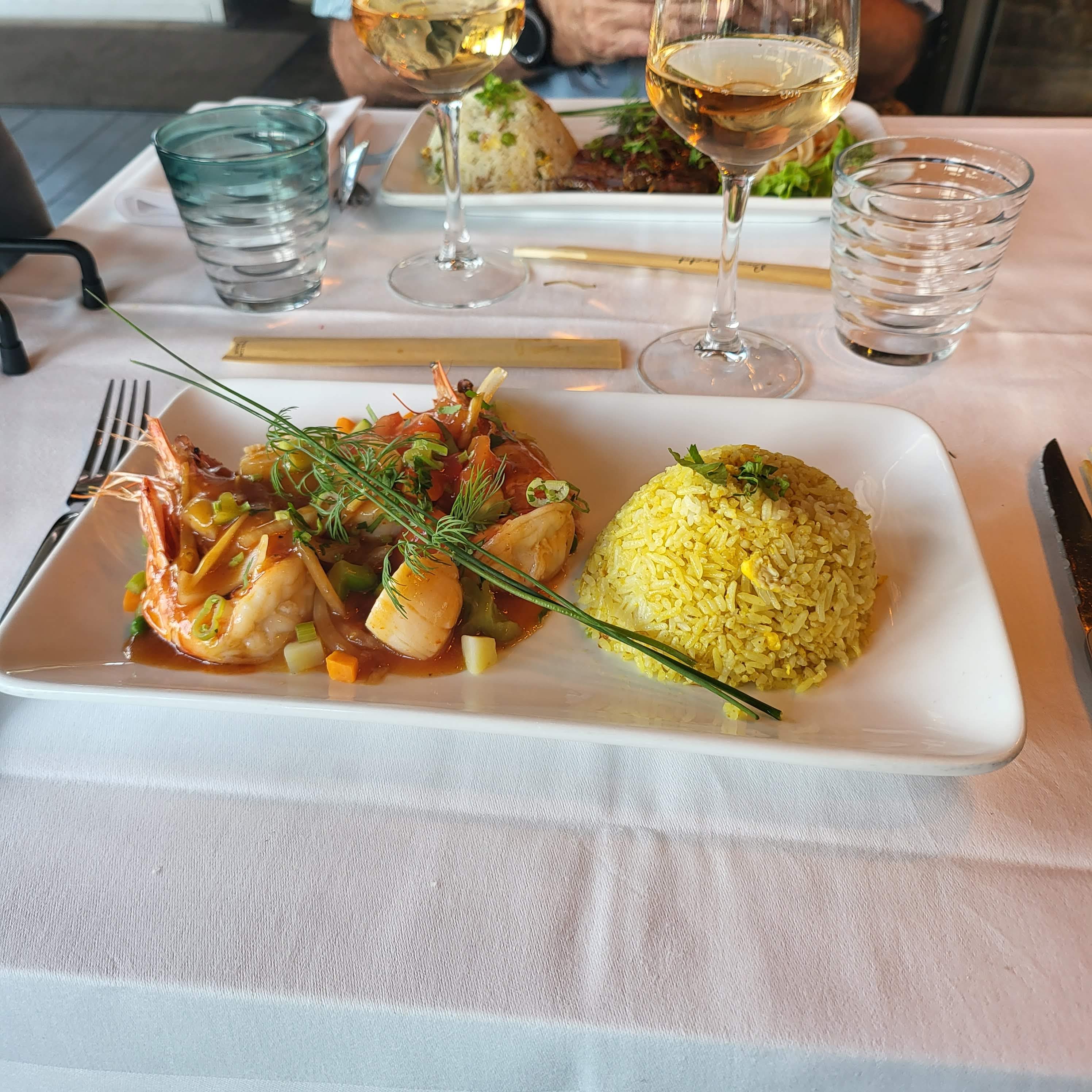 J'adore, tout pour passer un merveilleux moment. Le décor déjà, l'ambiance... La carte élaboré, bon prix. Bien accueilli, bien servi... Nous avons opté pour la brochette de bœuf farcie au calamars, gambas, amok, nouilles sautées, pâtes de riz. Pour le dessert ananas frais, mangue et riz de montagne, et un autre dont je ne me rappelle plus le nom mais voir les photos. Bonap...