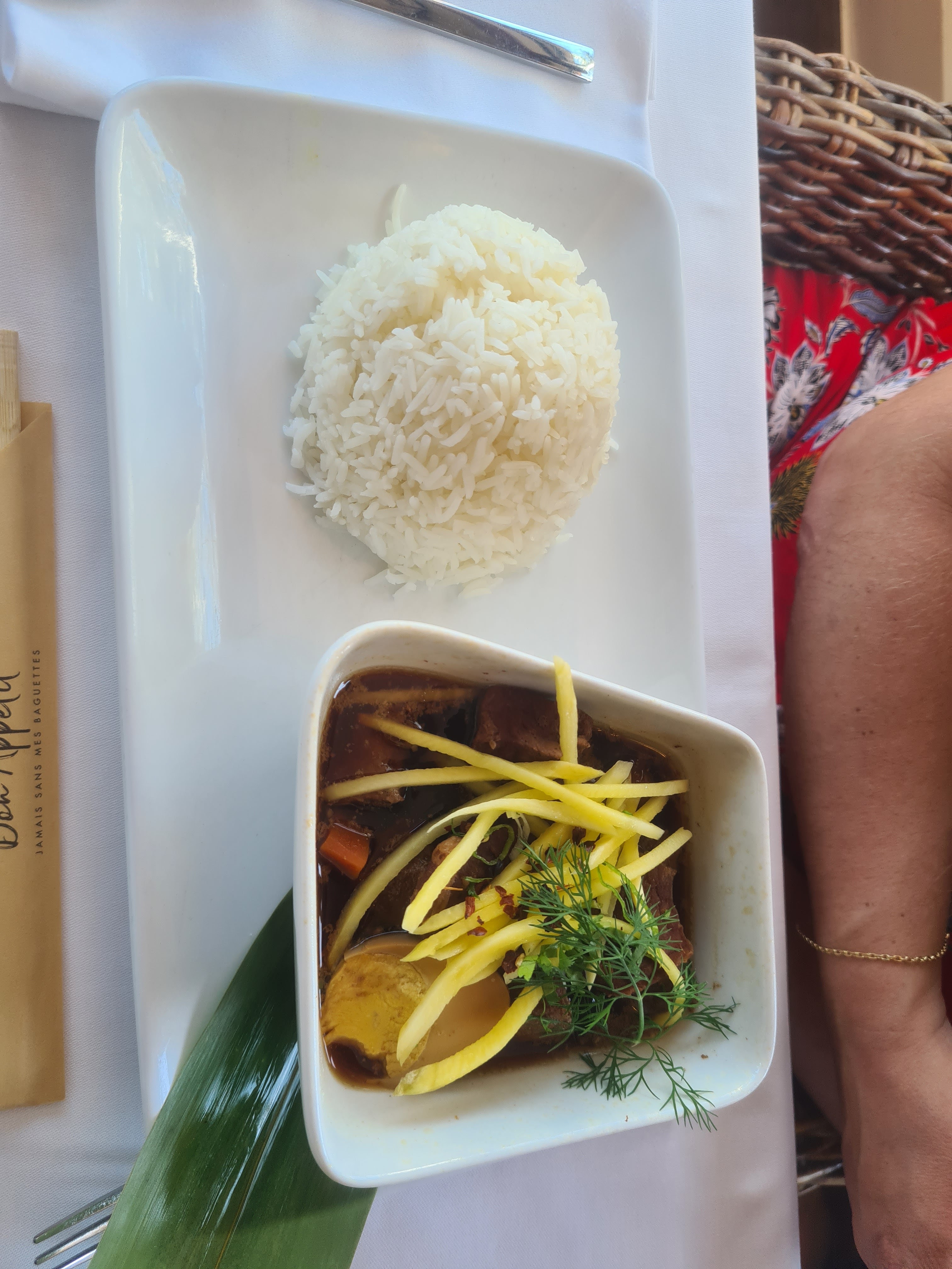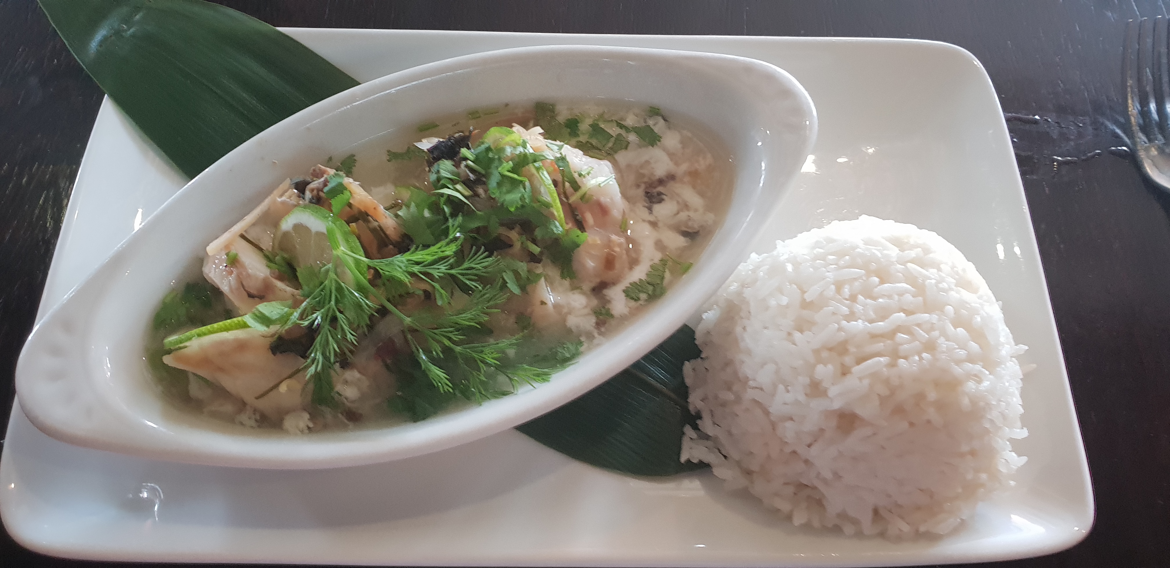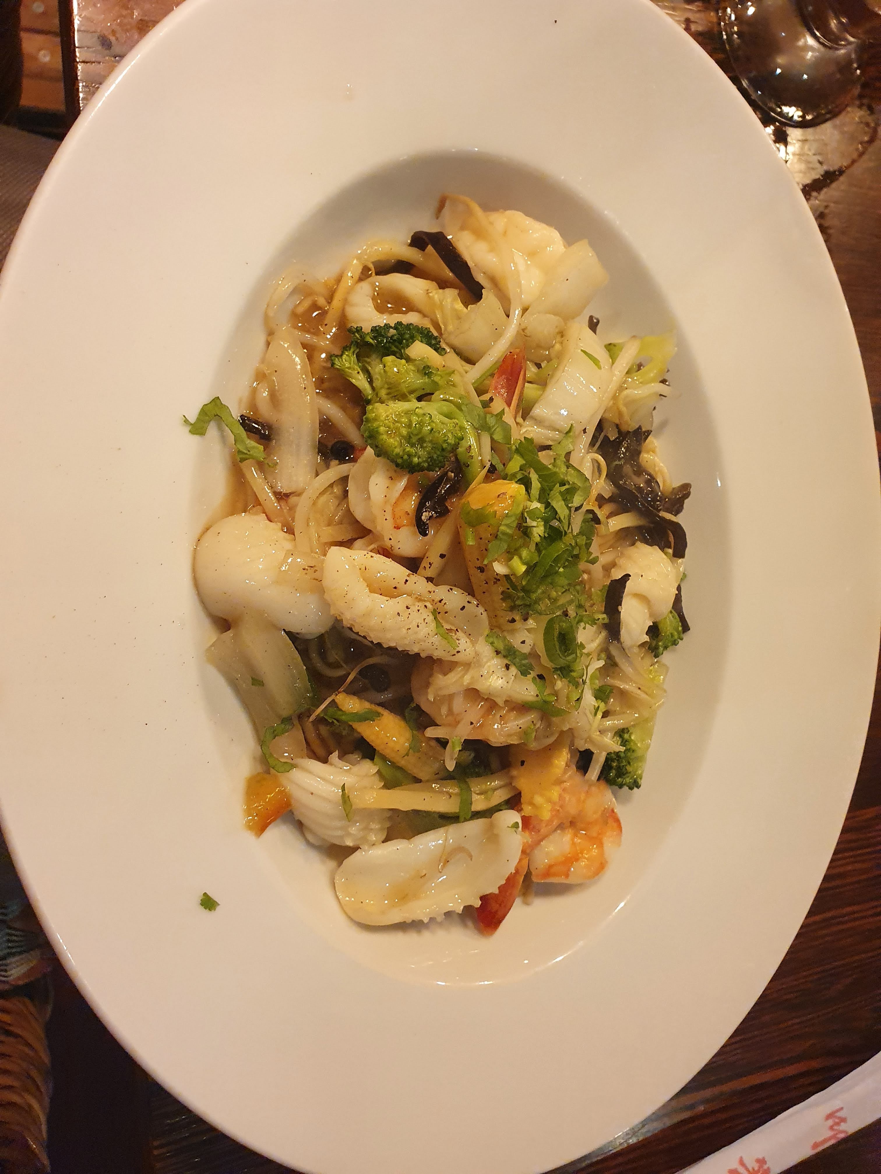 J'adore, tout pour passer un merveilleux moment. Le décor déjà, l'ambiance... La carte élaboré, bon prix. Bien accueilli, bien servi... Nous avons opté pour la brochette de bœuf farcie au calamars, gambas, amok, nouilles sautées, pâtes de riz. Pour le dessert ananas frais, mangue et riz de montagne, et un autre dont je ne me rappelle plus le nom mais voir les photos. Bonap...