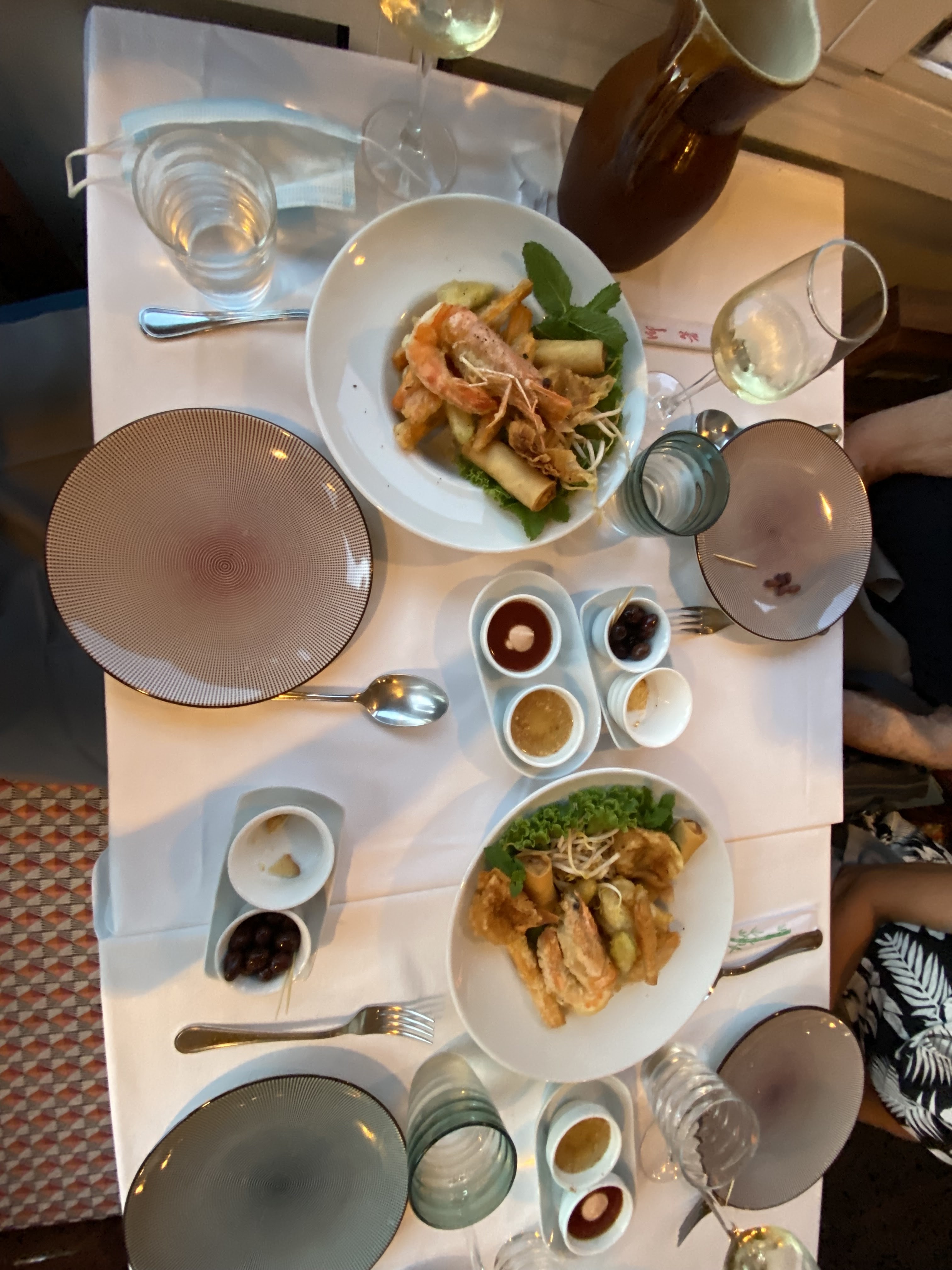 Nous y sommes allés un soir et nous avons beaucoup aimé. A deux nous avons dépensé 80 euros ce qui peut paraitre cher mais l'expérience en vaut la peine. Le service était très bien, le lieu décoré avec gout (en tout cas pour moi:)), les toilettes très propres (ce qui n'est pas tjrs le cas en dernier service !). Concernant le repas ; ce fut 2 verres de vins (très bon), un plat de NEM pour 2 en entrée, deux plats et un dessert pour 2. Les portions de plats sont bien équilibrées entre trop peu ou trop. La cuisine propose de cuissons réussies et beaucoup de saveurs.
