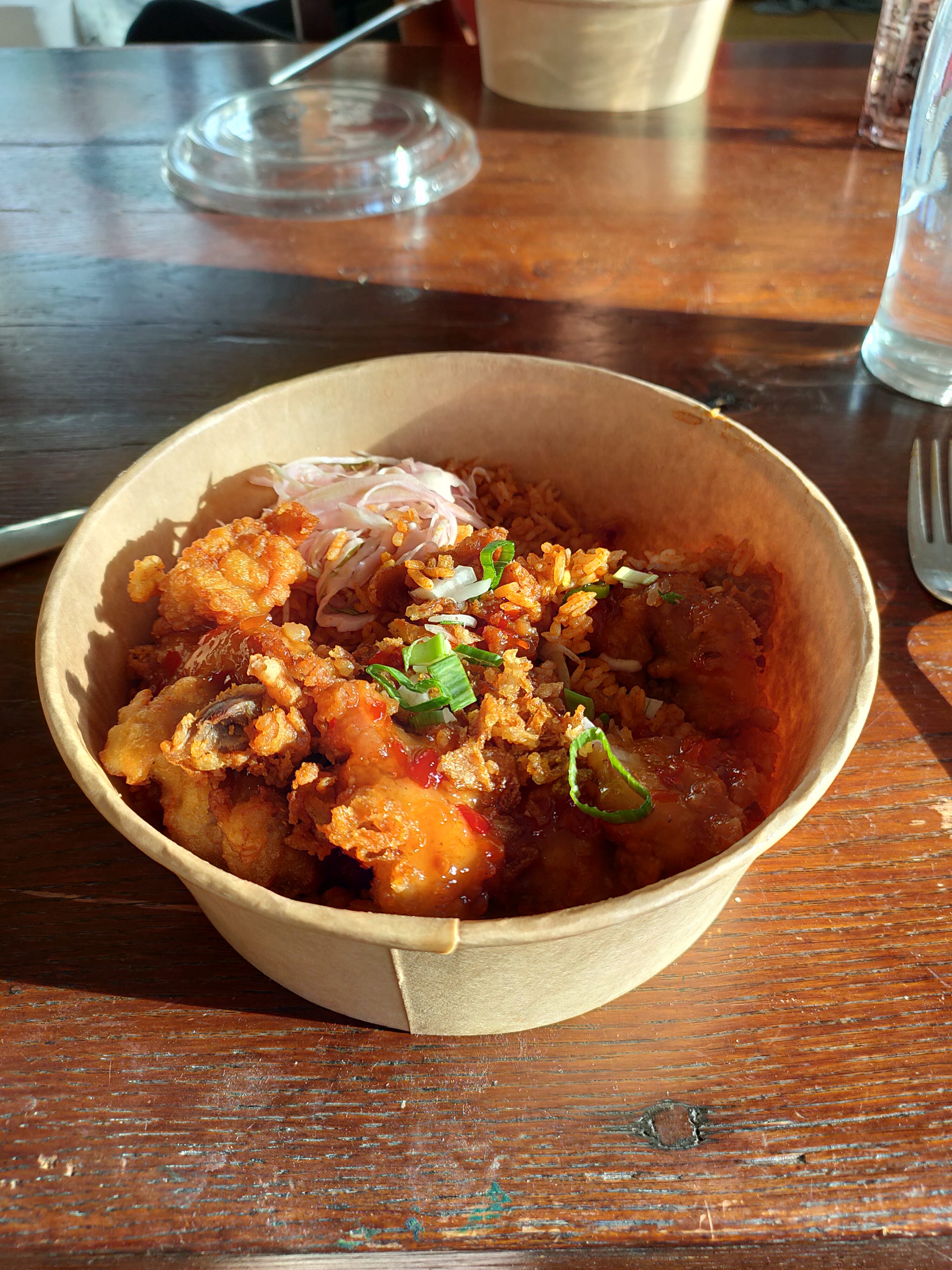 Très bonne découverte. Nous avons commandé un plat de riz avec poulet croustillant et son équivalent avec des nouilles. Les deux étaient très bons et très copieux. L'absence de toilette est un peu ennuyeuse mais la qualité du repas pour un si bas prix compense largement ce petit désagrément.